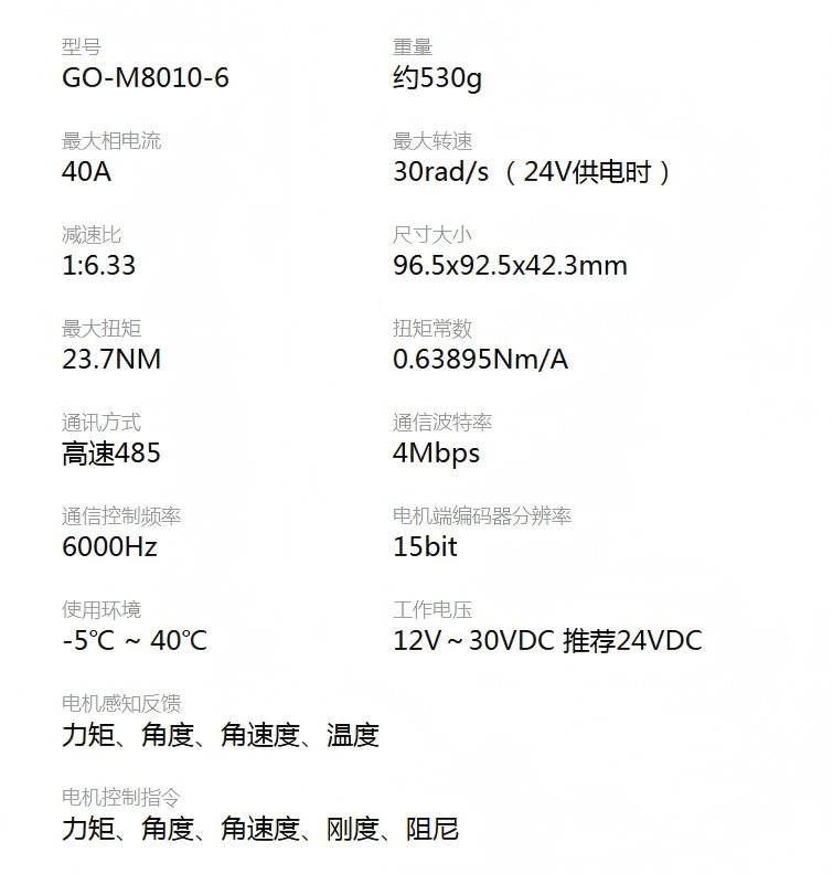 简介:无刷关节电机,内置减速箱,扭矩极大,适用于大负载的场景。底层采用 RS485 串行物理总线进行通信,通过控制 RE/DE 引脚切换收发状态。电机支持三种模式:0(空闲)、1(FOC)、2(标定),在其核心的FOC模式下,电机支持位置、速度和力矩的混合阻抗控制。