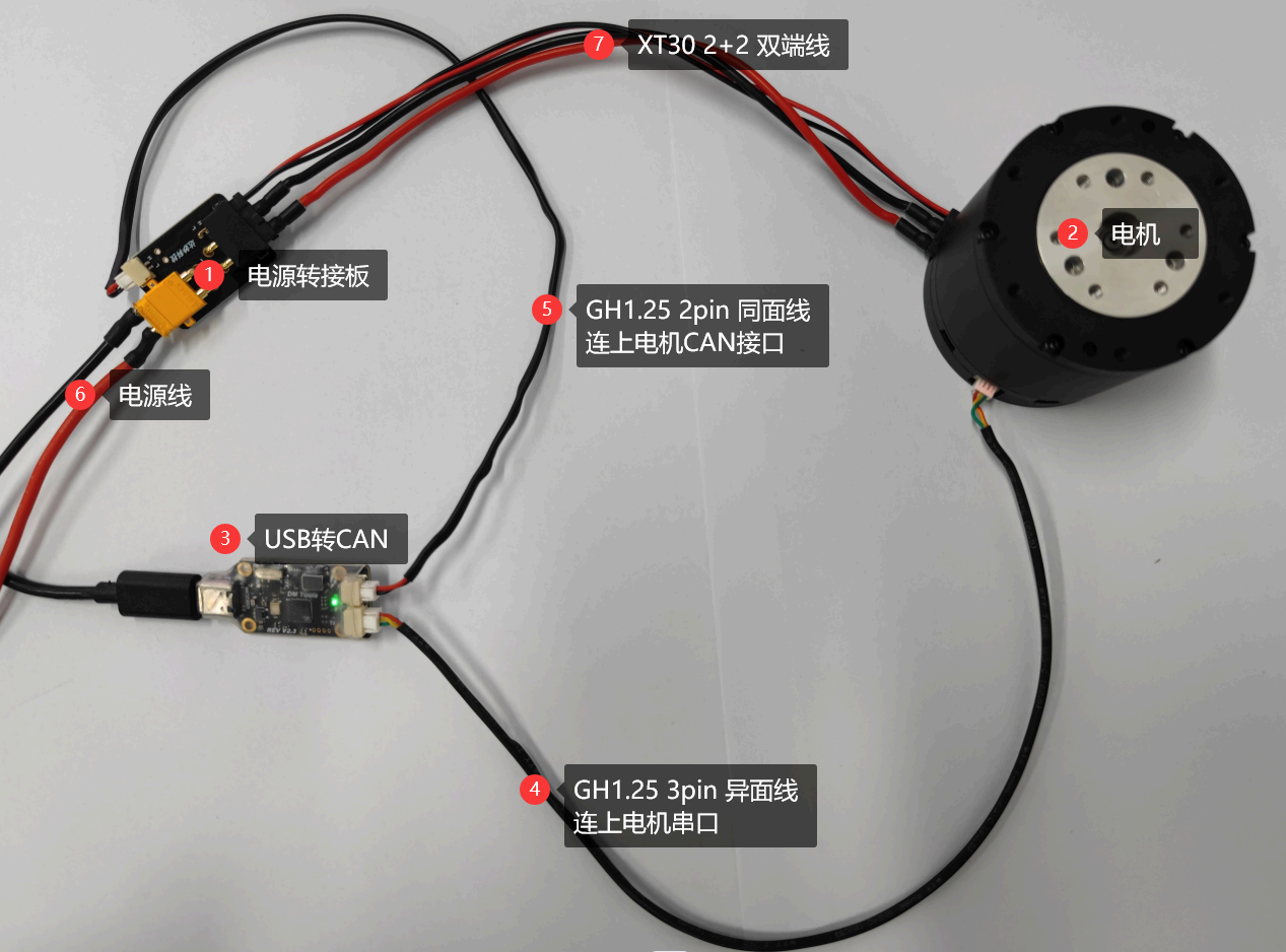 图中不需要电源转接板,可以提供24V电压即可,重要的是USB转CAN模块和电机的CAN线,上电后观