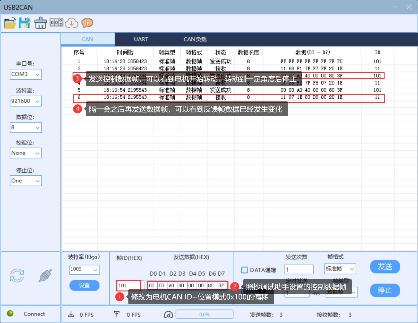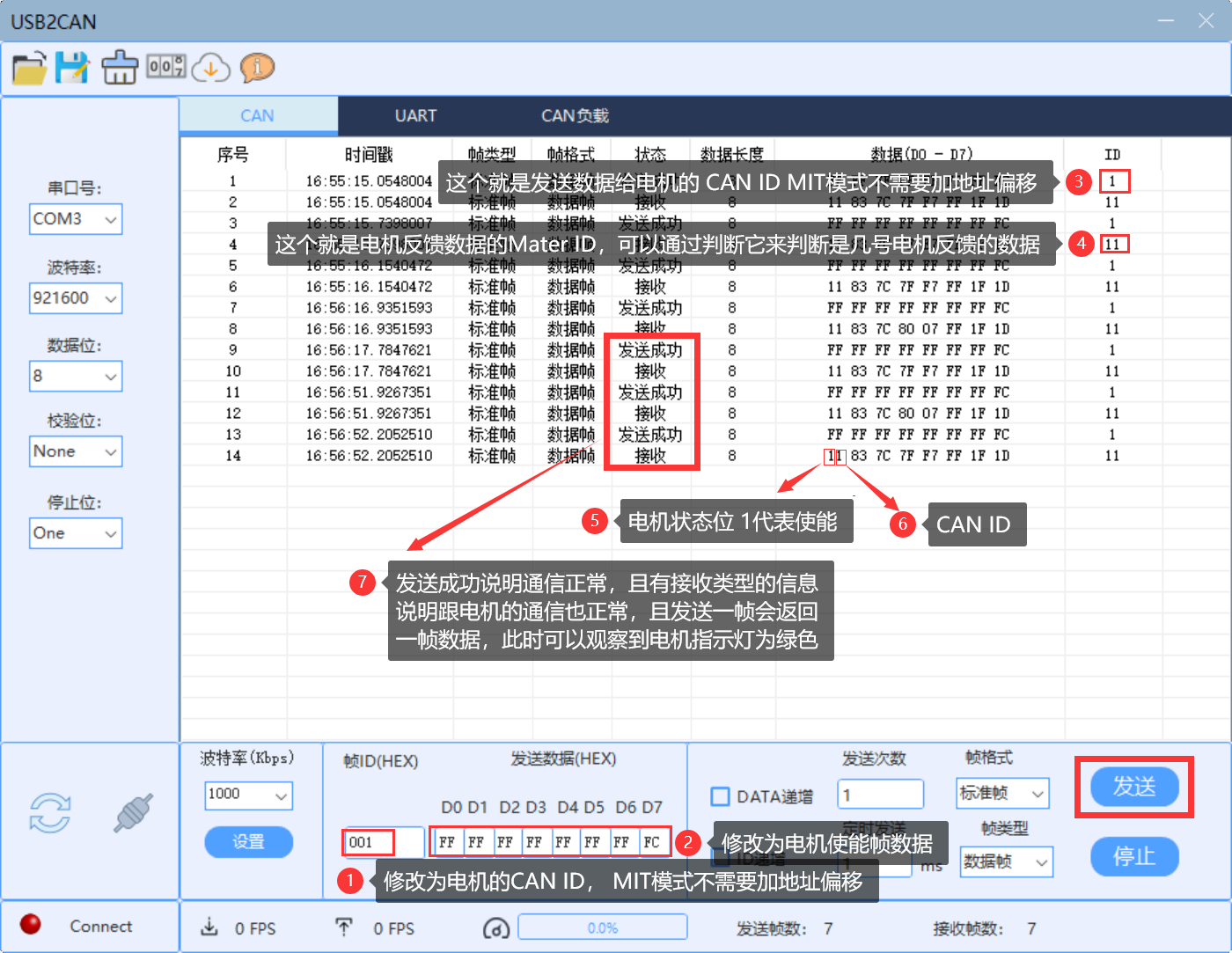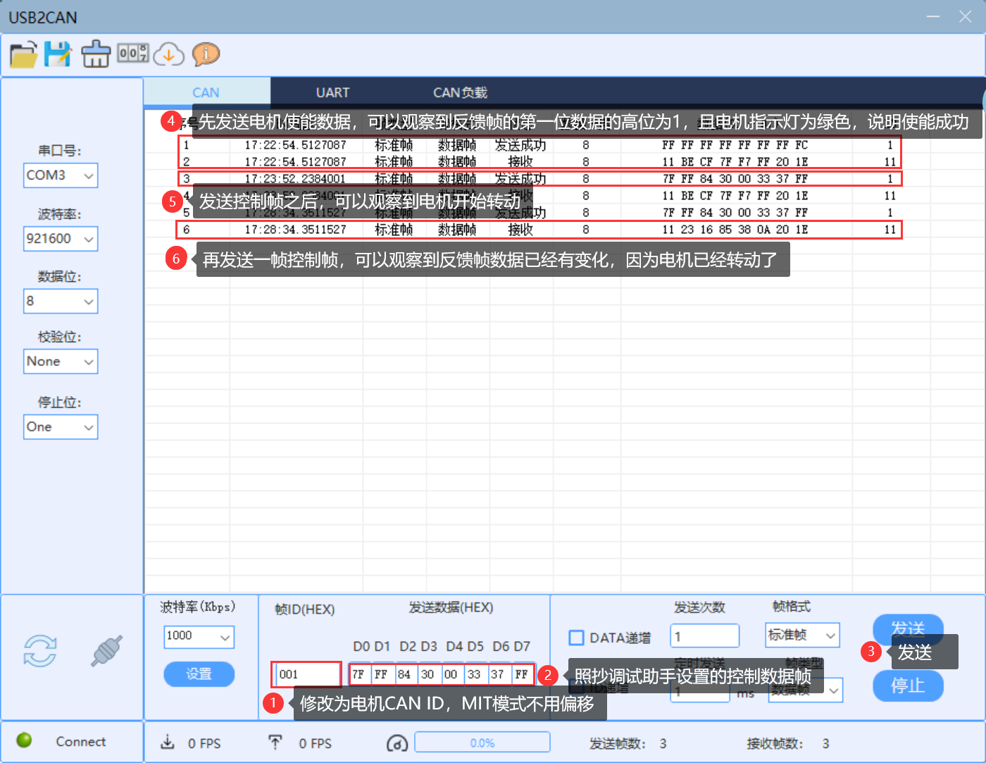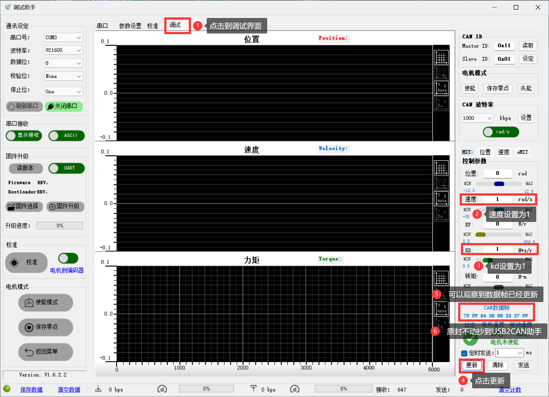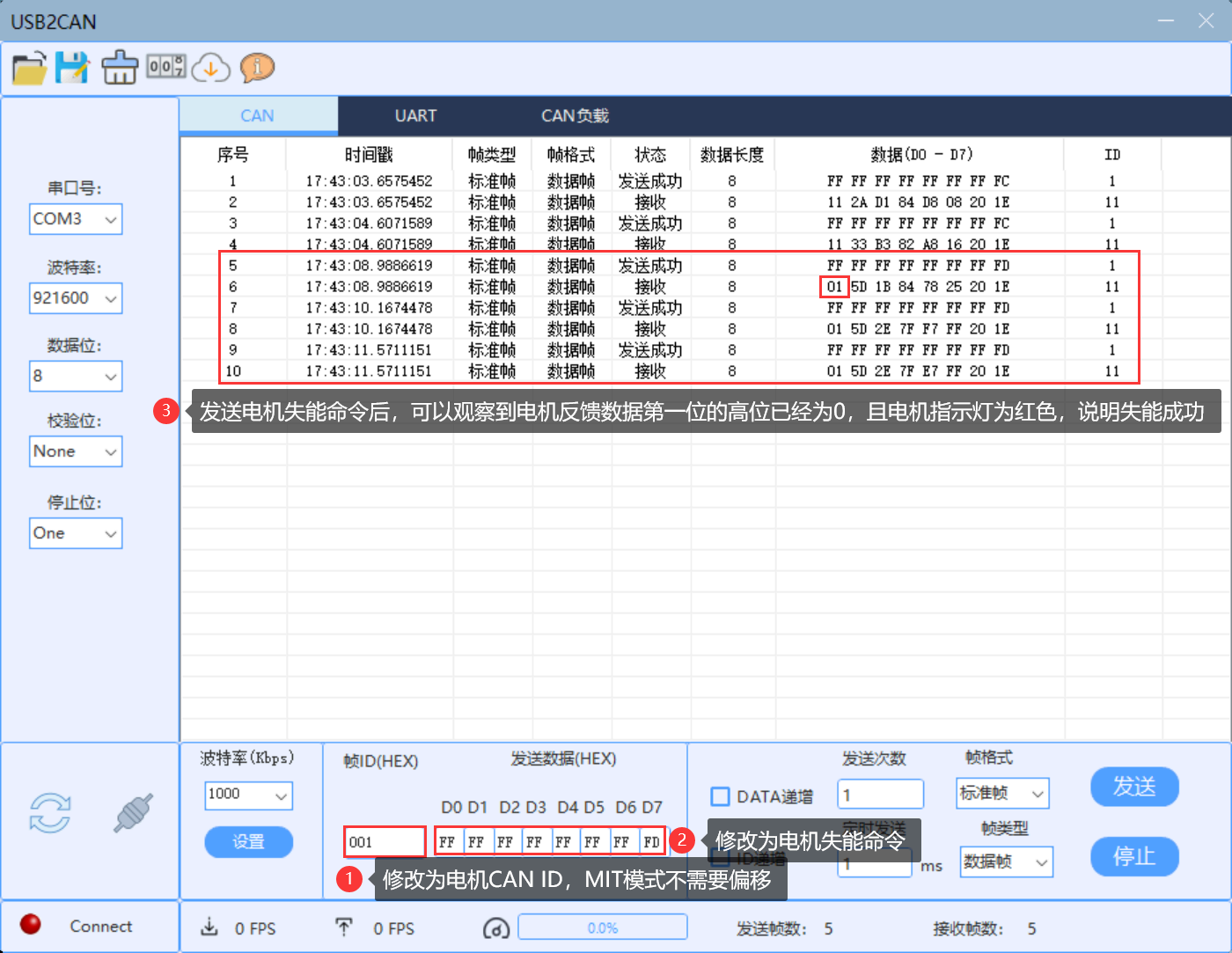 以上是用USB转CAN助手实现MIT控制示例,其他俩种模式实现方法相同,唯一需要注意的是CAN ID的 偏移,比如位置速度模式的CAN ID