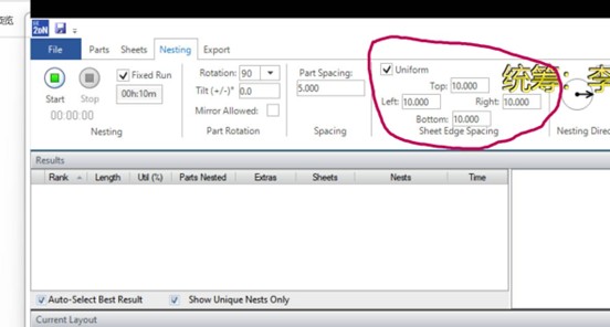 排版设置:红线圈出来的地方为零件边界与雕刻边界的实际距离,一般设置为10,设置完后点击start即可,当选项卡右上的函数水平时,零件排版完成