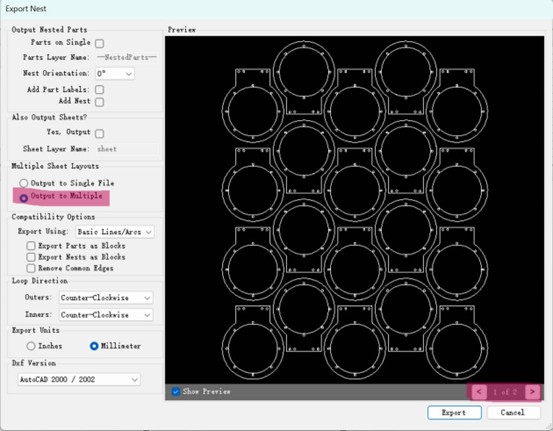 如下图所示,若所要雕刻的零件数量多,需要两块板才能雕完,导出时选择Multiple,右下角箭头可以查看两块板上的内容,保存后软件会自动保存为两个DXF文件