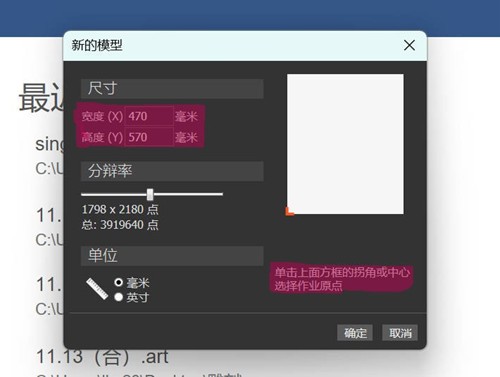 将刚刚排版好的DXF文件导入,便会弹出模型尺寸的设置(软件会依据你所有要雕刻的零件计算出一个能刚好包裹整个零件轮廓的最小矩形的长宽),设置如下