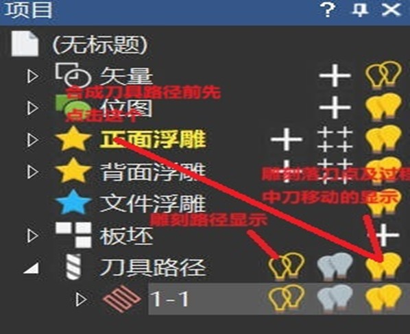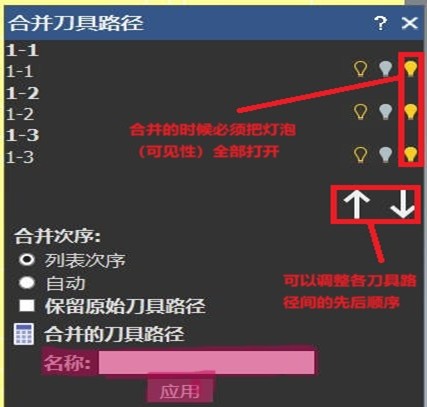 设置好雕刻路径后,若要改变雕刻的先后顺序可以长按红色图标上下拖动进行路径顺序的调换,先将设置好的刀具路径保存为art格式的文件(防止之后合成刀具路径后没法更改雕刻的参数和具体设置),然后在项目栏里点击刀具路径后下方会出现刀具路径操作点击标红区域合成刀具路径