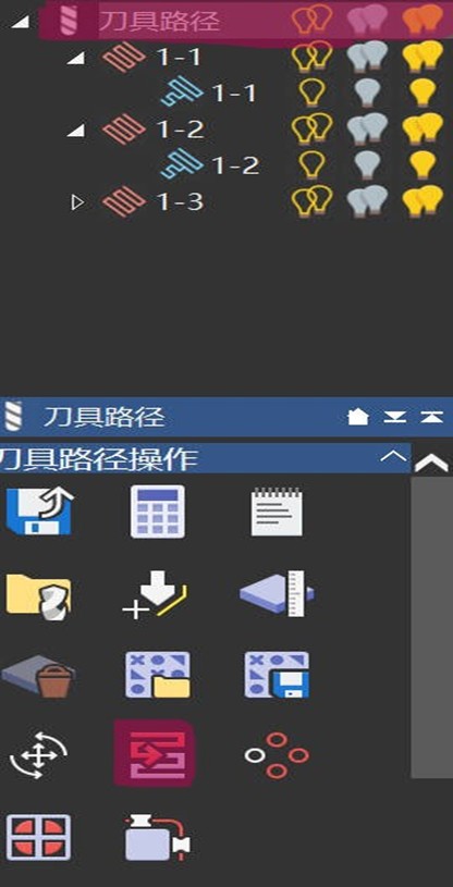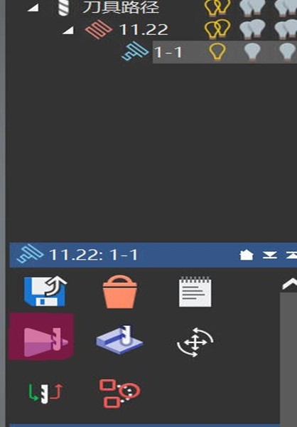 设置好后,在右边项目里可以看到设置好的雕刻路径,例如:1-1就是刚刚设置好的刀具路径,点击1-1旁边的小三角,在下方会出现一个蓝色的图标双击后,可以继续编辑刚刚的路径