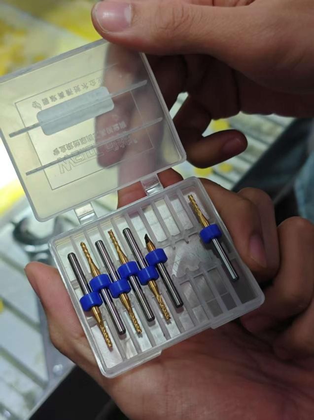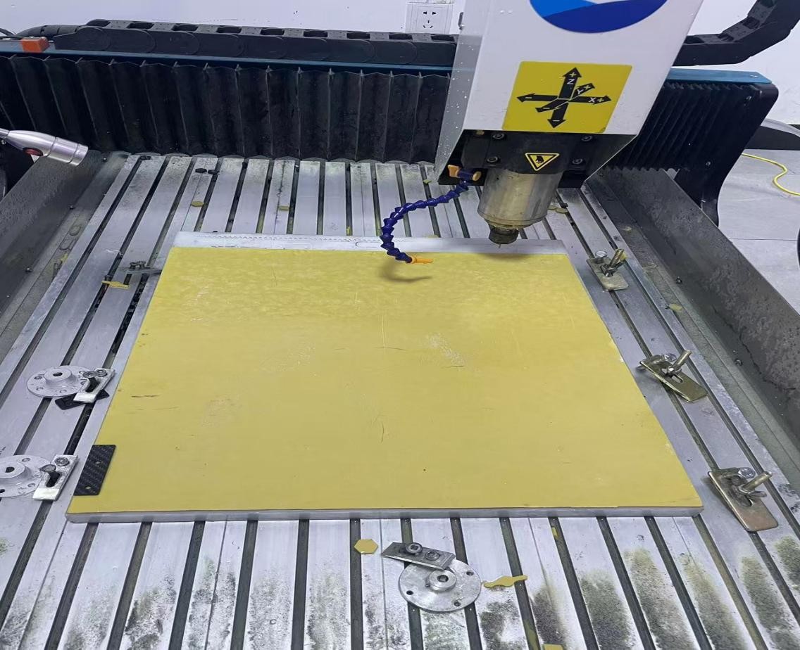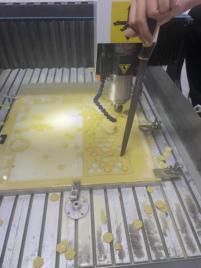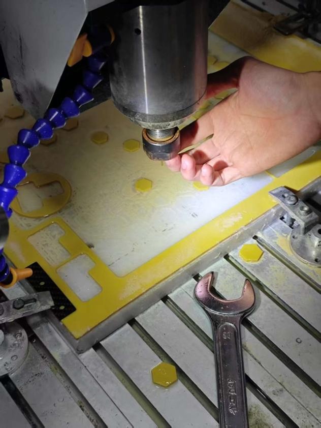第八步,雕刻过程中,对于大的零件,需要有人在旁边用锉刀抵着板材,防止翘起来影响刀具移动,从而起到保护刀的作用,还需要有人在水满时打开抽水机抽水,没水时打开水龙头放水。