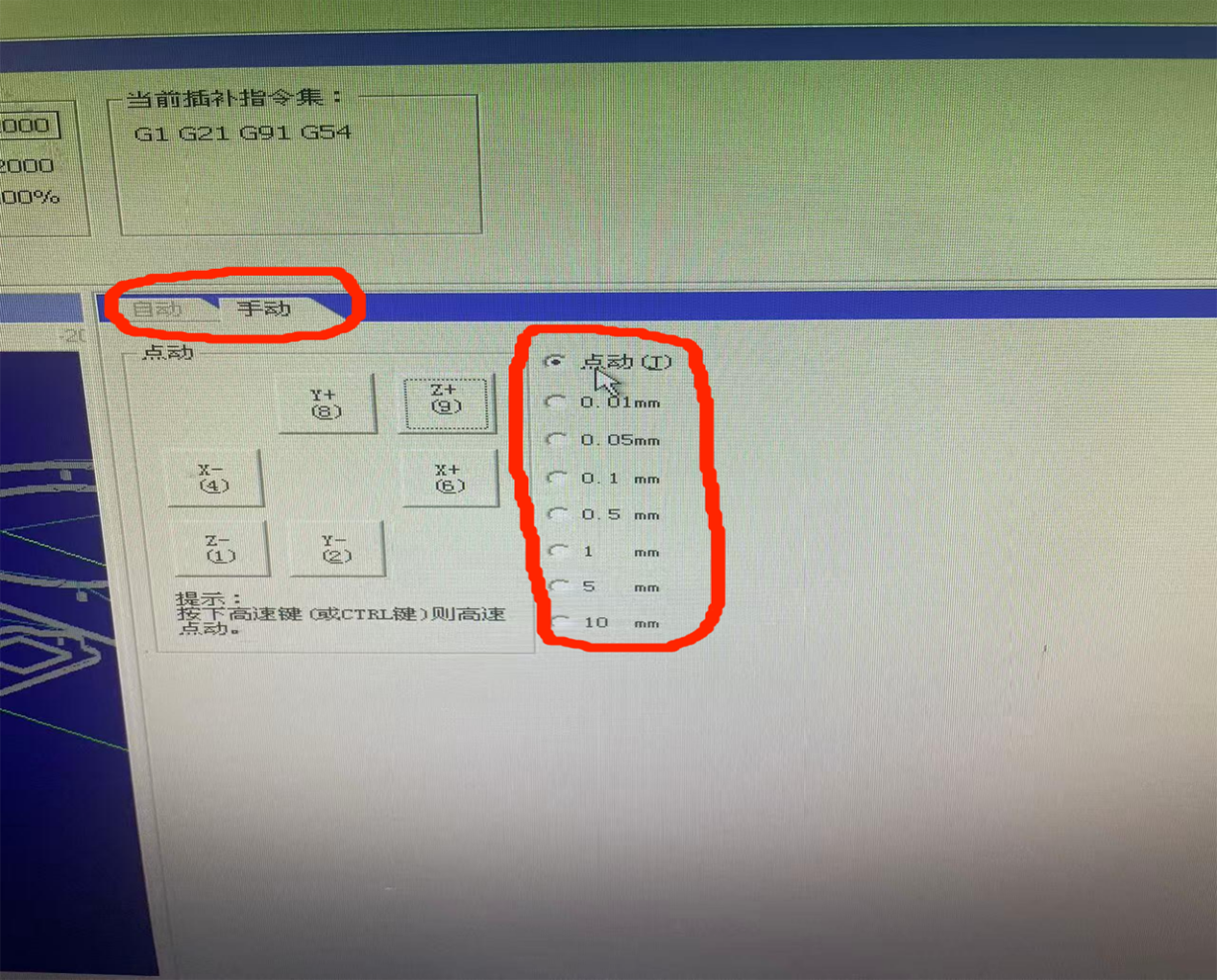 第五步,打开软件(软件为N开头的),软件最右侧点击手动后可以手动控制雕刻机,与手动相并的自动是放代码文件的,不用管,点击对应按键,便可以操控主轴,实际坐标系对应如下
