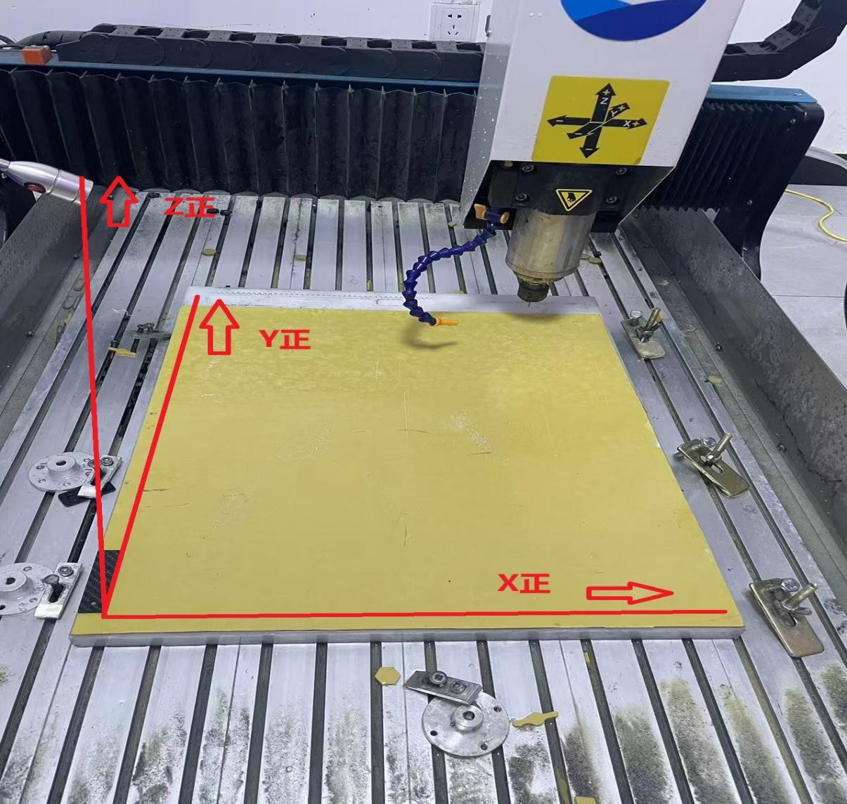 第七步,设立工作原点,工作原点是刚好接触板材的表面,设立的操作与调平时接触板材上的点一致,如果要雕刻一块完整的板子,工作原点一般设置为左下角,如果左下角已经被雕过了,那么可以选择板上其他地方,但一定要确认好你选择的工作原点的右上角要雕刻零件的区域是否足够,会不会碰到旁边的固定夹子!可以通过移动主轴,观察坐标来进行可雕刻区域的评估。