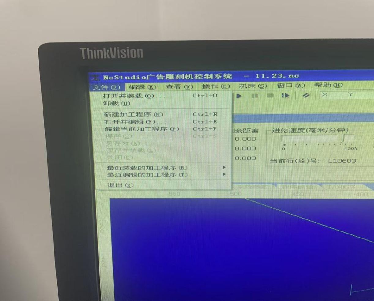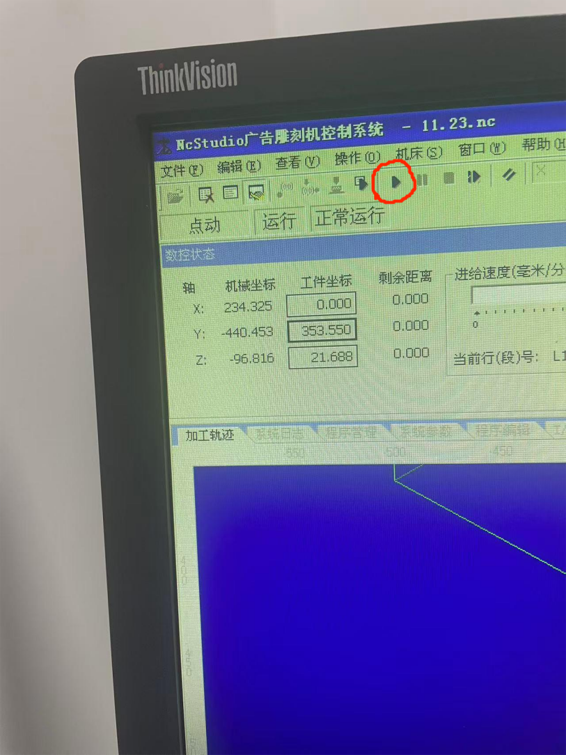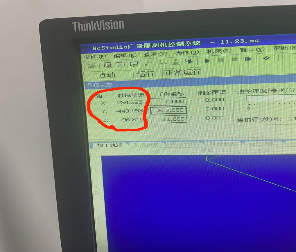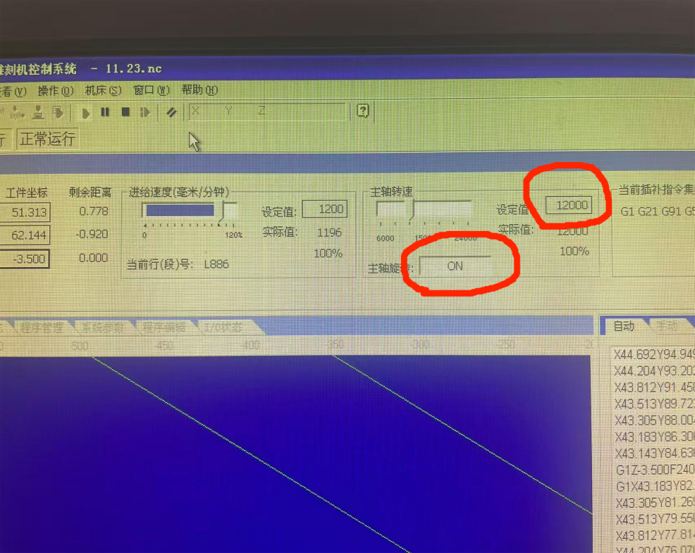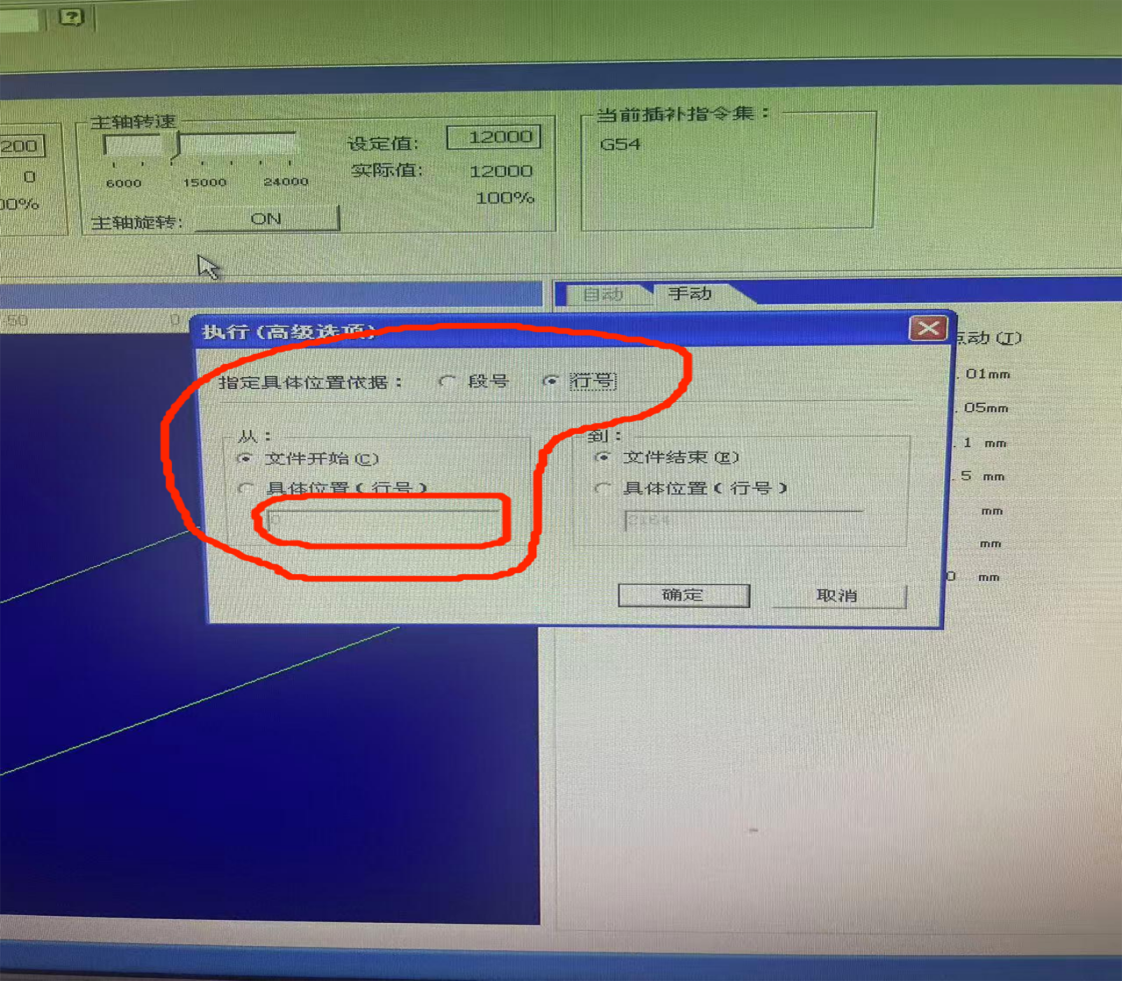 另外:雕刻过程中刀可能在中途断掉,这时需要马上按下急停,等主轴停止转动后,在电脑软件操作中点击高级开始,读取并记忆停止时的行数(在下图的圈出区域中读取),再打开急停将主轴抬升到合适的位置,再按下急停进行换刀,换刀前检查3次是否已经按下急停!换刀步骤如下: