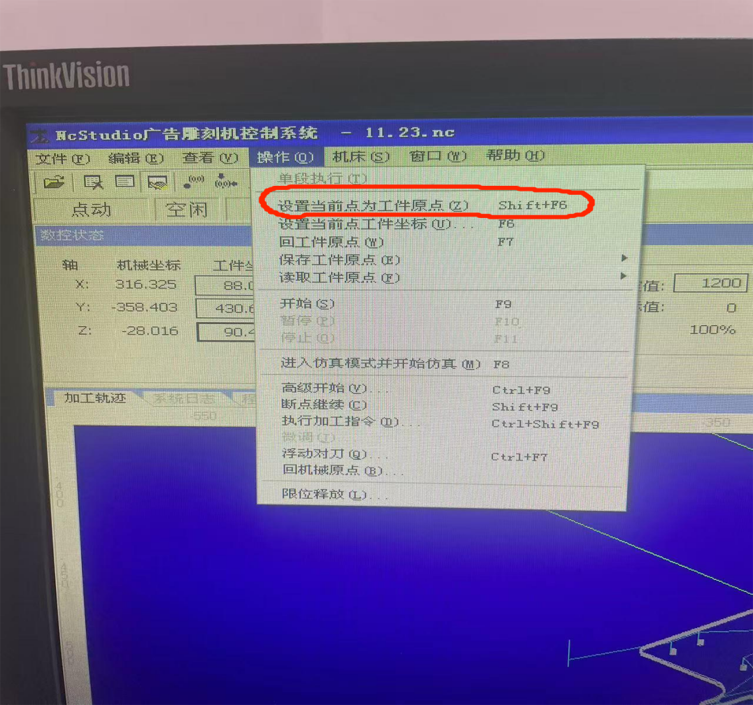 控制刀具移动到工作原点后,在软件界面操作出,点击设立当前点为工件原点即可,或者依次单击机械坐旁边的工件坐标X,Y,Z,工作坐标会全变为0,此时也是工件原点