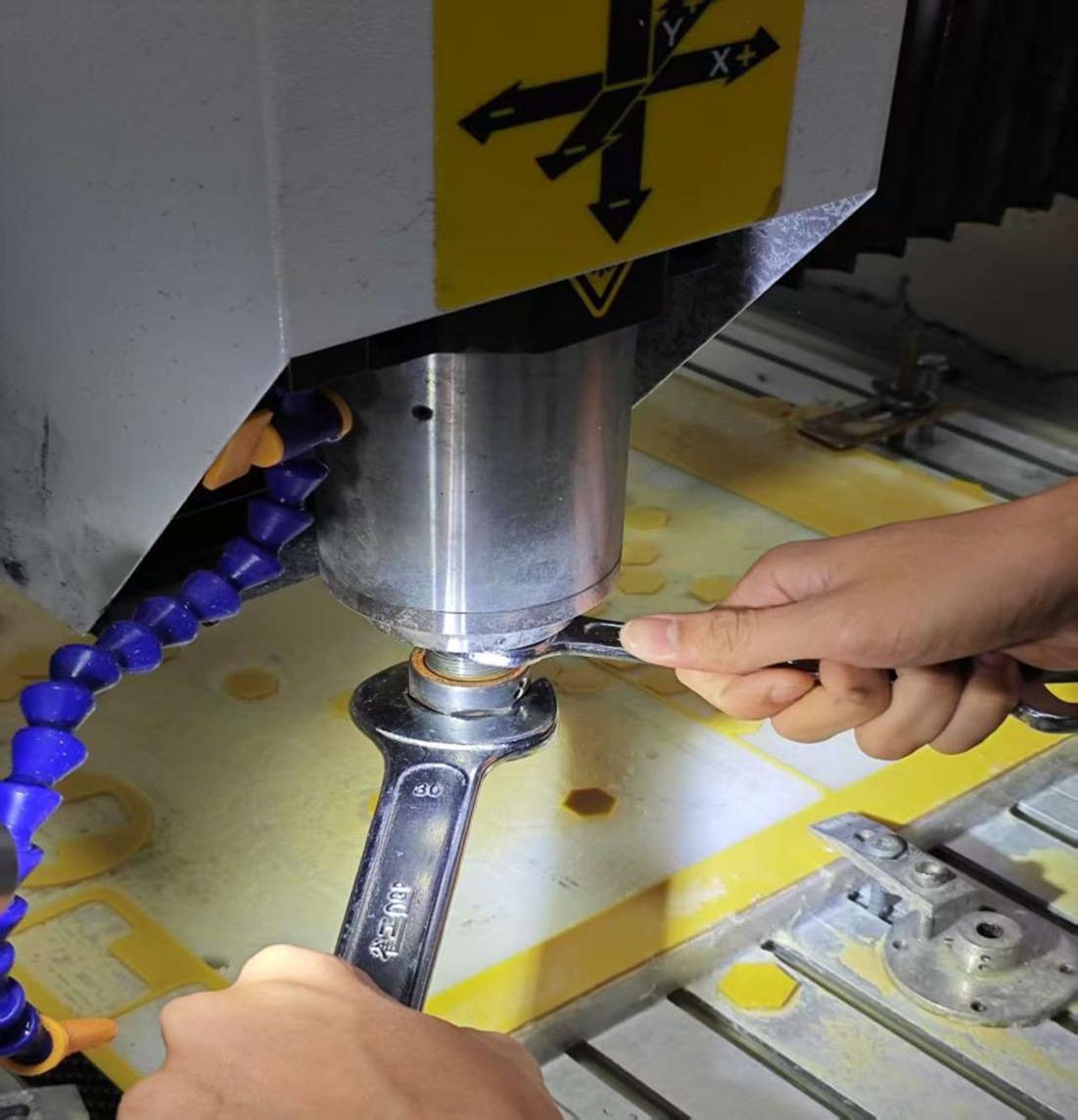 换刀时,固定刀头的头套不用完全松下来(省点事),松到刚好能让刀取下来就行,然后取下刀,拿新刀对准头套上的洞插进去,重新旋紧头套,旋紧时一定要一只手将刀具紧紧的顶在头套上,然后再旋紧,旋到两个扳手拧不动就可以了