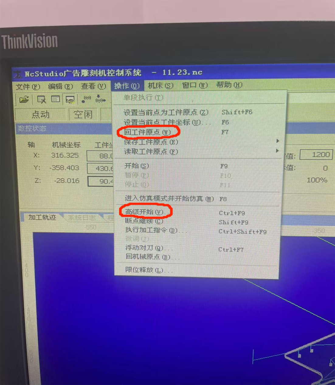 换好刀后,打开急停,然后点击ON让主轴旋转起来,接着在操作里点击回工件原点,看看原点的位置是否改变(换刀时可能会出现移动了主轴改变了原点的情况),若改变,可以通过最开始设置原点时在板材上留下的小洞,来重新设置回原先的原点(不然若直接高级开始,雕刻的整体轨迹会全部改变),若不变,则点击操作中的高级开始,在圈出区域的行数中将先前记忆的行数减个几十行填入,看看有没有回到断刀前的轨迹,若没有,立即点击与开始件同一行的方形暂停键,停止雕刻,然后继续往下减,直至回到断刀前走过的路径即可