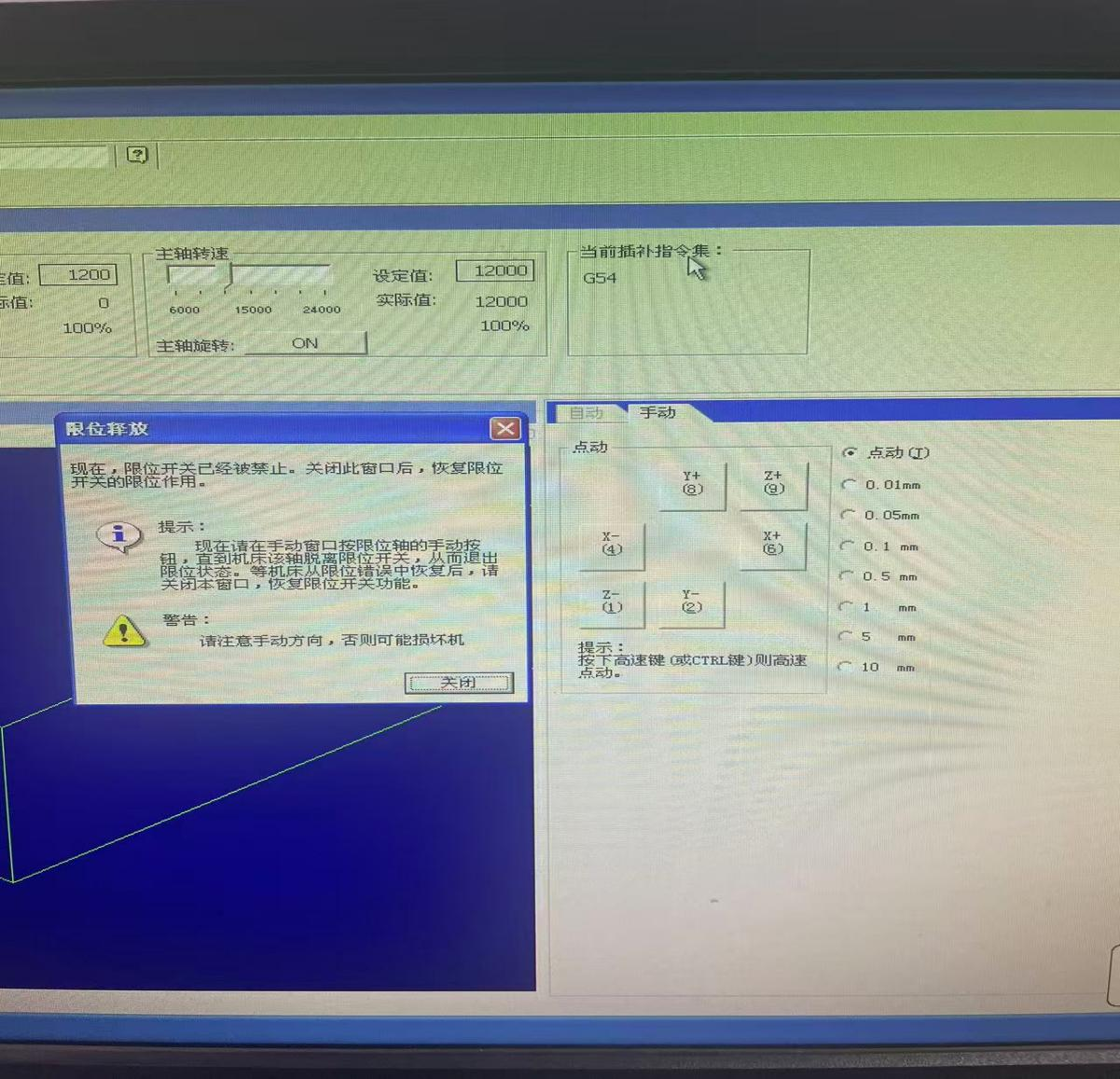 还会遇到一种情况就是,雕刻机的主轴移动到雕刻机的最大工作区域时,会弹出限位警告,这时手动会被限制,你没法通过手动鼠标点击来控制主轴移动,这时,需要点击操作中的限位释放,注意此时会弹出一个对话框,千万不要打叉,将它拖动到一旁,此时就可以通过手动重新控制主轴移动,使它脱离出极限区域后再打叉就行,这时便不会限制手动了