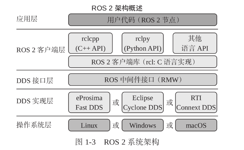 ros2的系统架构可以分为5层:操作系统层、DDS实现层、DDS接口层、ROS2客户端层和应用层