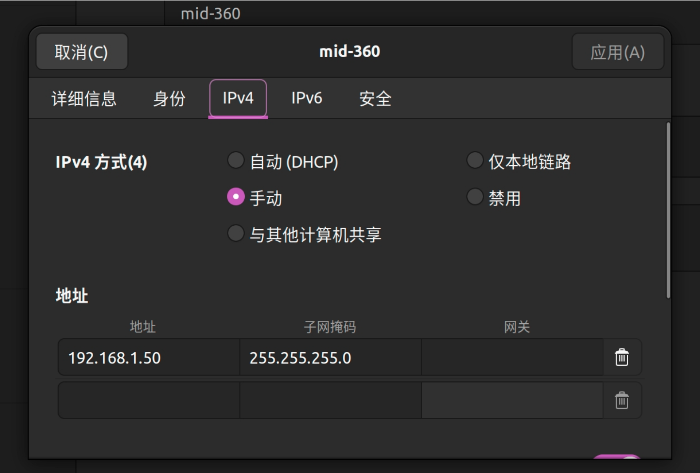 进入主机设置 - 网络,然后在有线处添加,名字随便你取,我们一般取 mid-360,然后点击 IPv4,改为手动,在底下添加如下所示: